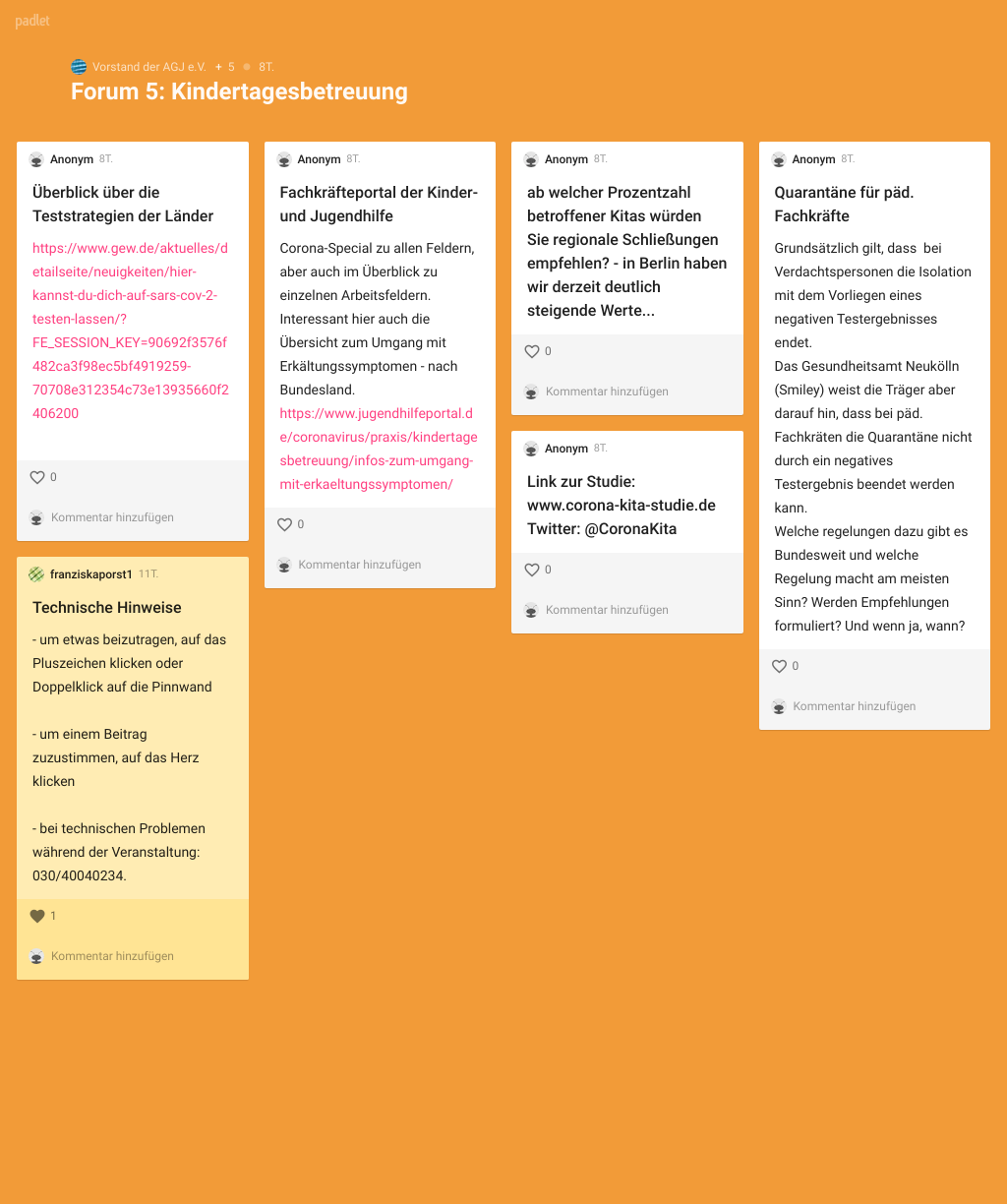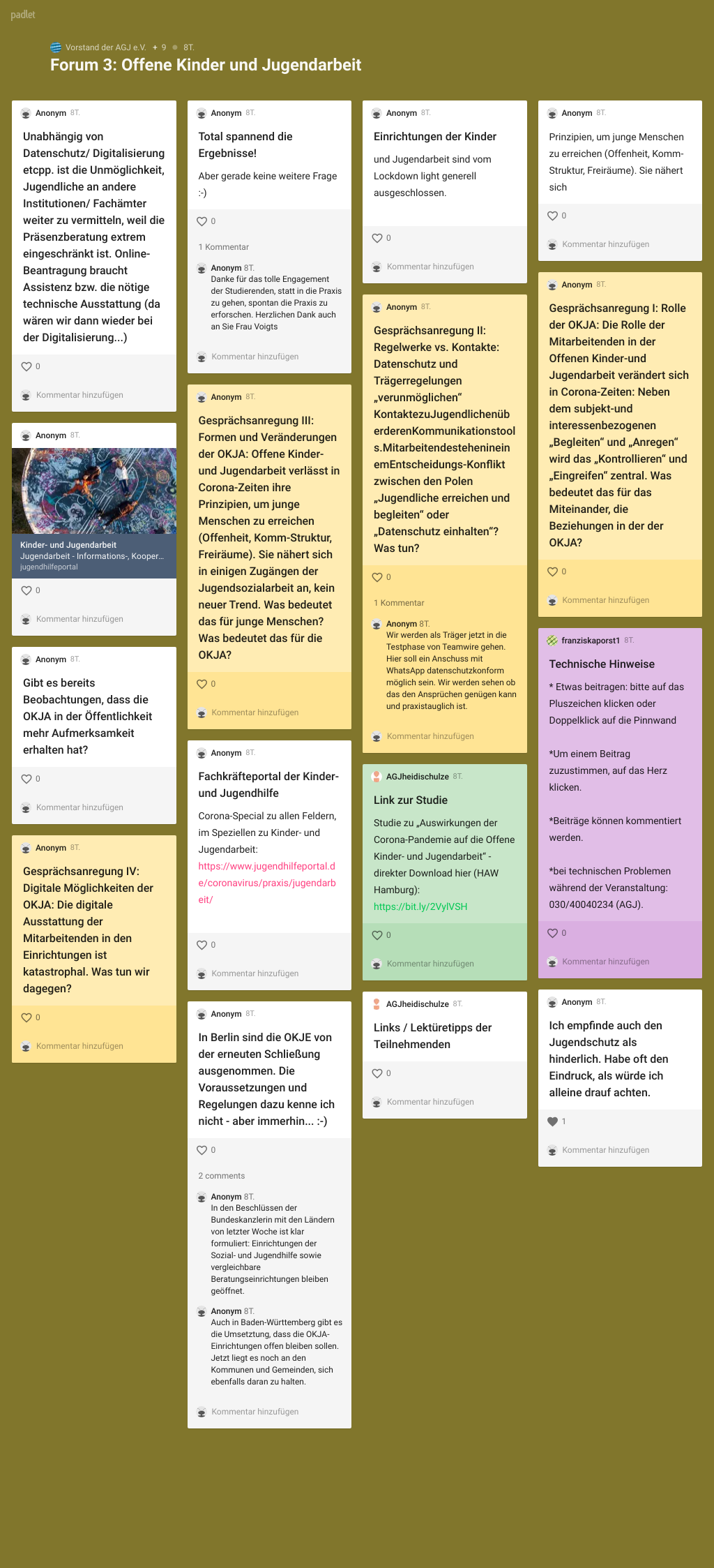 Der dritte Themenblock „Auswirkungen auf Profession, Träger und Strukturen der Kinder- und Jugendhilfe“ startetet mit der Vorstellung der Ergebnisse der Studie zur Zusammenarbeit von öffentlichen und freien Trägern im Krisenmodus von Dr. Koralia Sekler vom AFET und Prof. Dr. Florian Hinken von der Evangelischen Hochschule Berlin. Im Anschluss zeigten Prof. Dr. Christina Buschle von der IUBH und Prof. Dr. Nikolaus Meyer von der Hochschule Fulda professionstheoretische Forschungsnotizen zur Corona-Pandemie unter der Frage Soziale Arbeit im Ausnahmezustand?!. Abgeschlossen wurde dieser Themenblock mit einer Gesprächsrunde, an der neben den genannten Referierenden auch Dr. Susanne Heynen (Jugendamt Stuttgart) und Marion von zur Gathen (Paritätischer Gesamtverband) teilnahmen und die Perspektive der Praxis auf die Studienergebnisse einbrachten. Kommentare und Fragen der Teilnehmer*innen wurden über eine digitale Pinnwand (padlet) eingebracht.